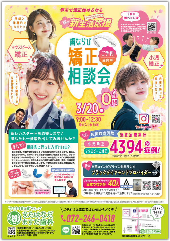 きたはなだますだ歯科・矯正歯科 / 〒591-8002 大阪府堺市北区北花田町 2-4-1コプリー1階 /大阪メトロ御堂筋線「北花田駅」より徒歩1分