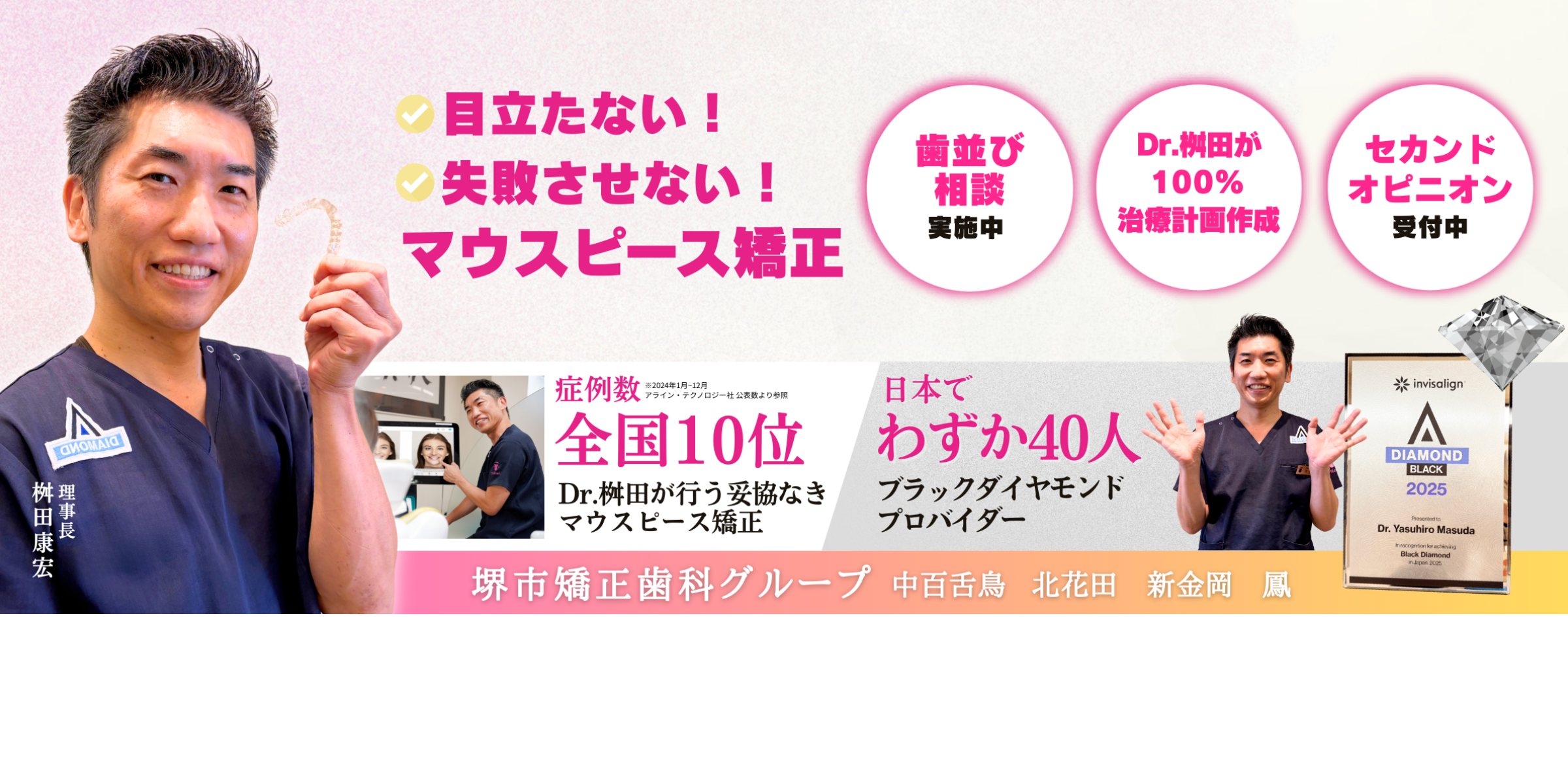 当グループは、堺市にある「なかもずますだ歯科」「きたはなだますだ歯科」「しんかな歯科」「鳳よしむら歯科」のどの歯科医院でも、マウスピース矯正「インビザライン」を受けていただけます。矯正歯科治療は、当グループ総院長の桝田が担当。どの歯科医院でも同じクオリティのインビザライン治療をご提供いたします。
